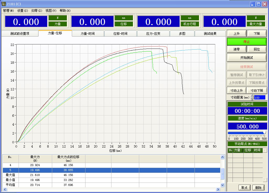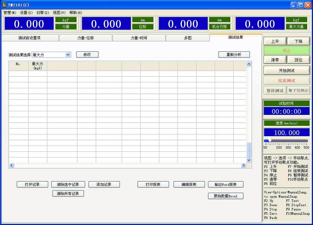 G. the result of test can be automatically preserved or manual preserved, test can automatically calculate the most strength, up and down yield strength, loop method, best method, non-proportional extended strength, tensile strength, compressive strength, tensile strength at any point, constant load extension, elastic modulus, rate of elongation, peel range of maximum, minimum, average, force, total energy, bending modulus, x% load in break displacement, load X% in break displacement, and so on . the test data can be stored in any disk.